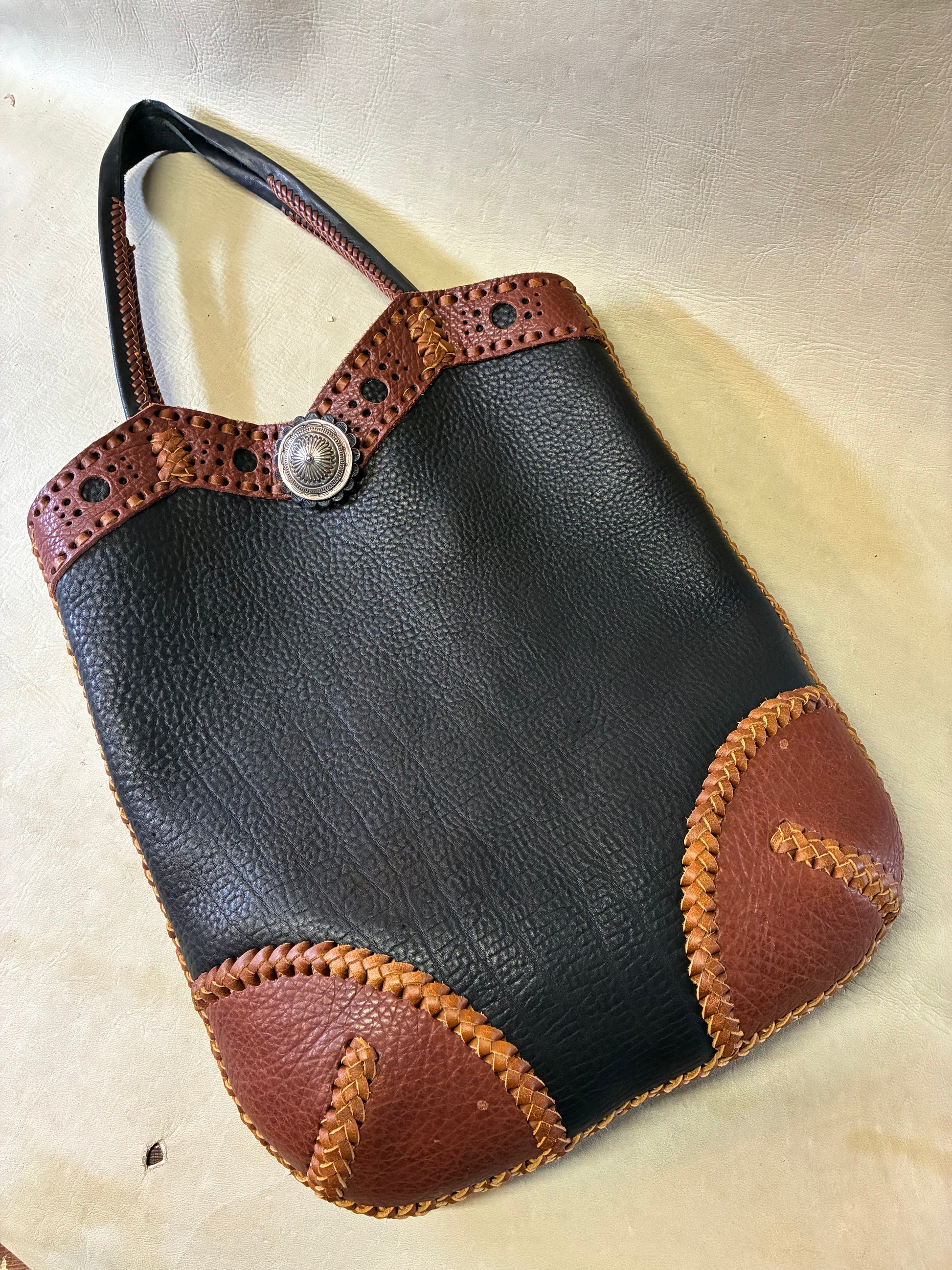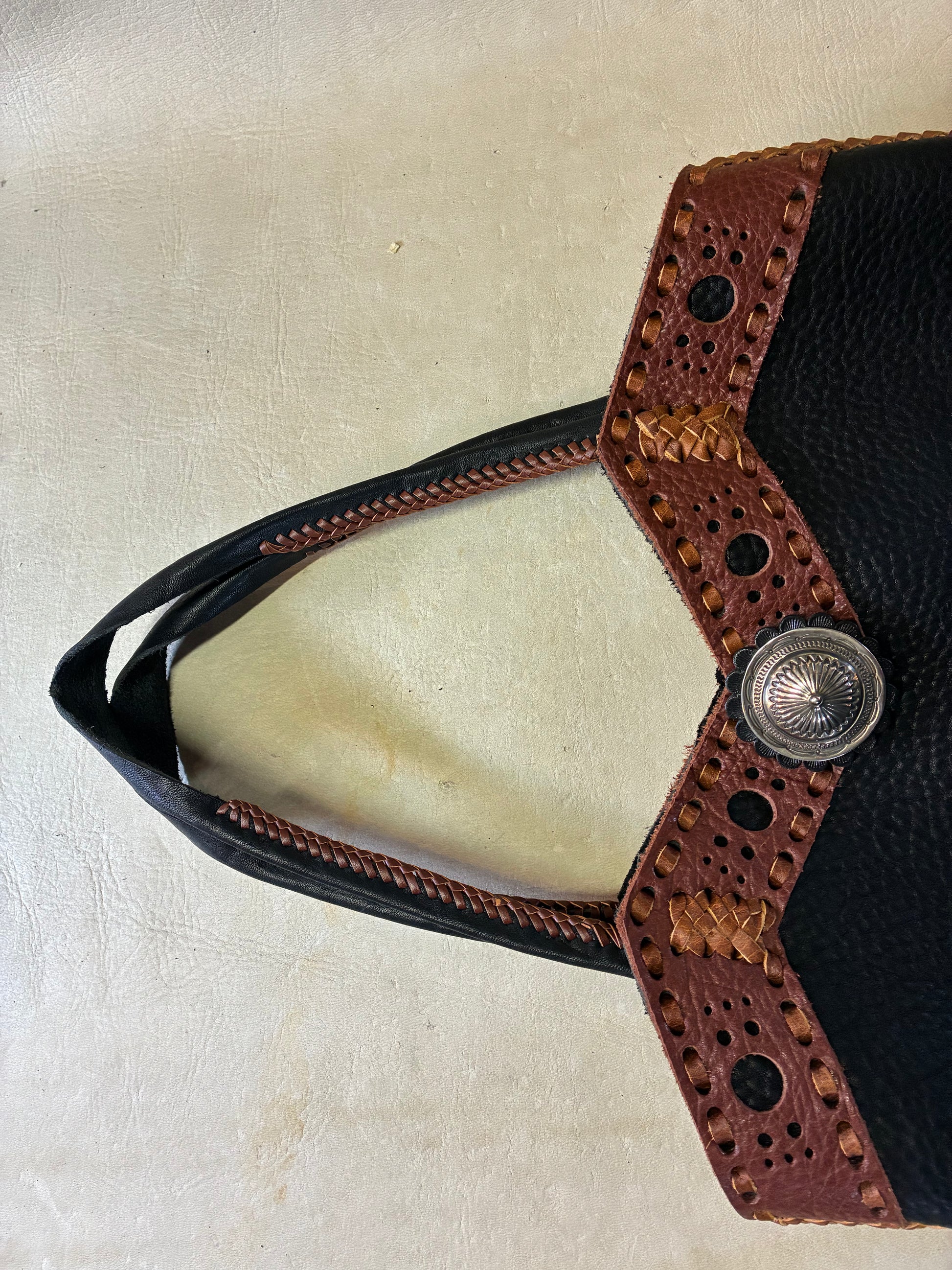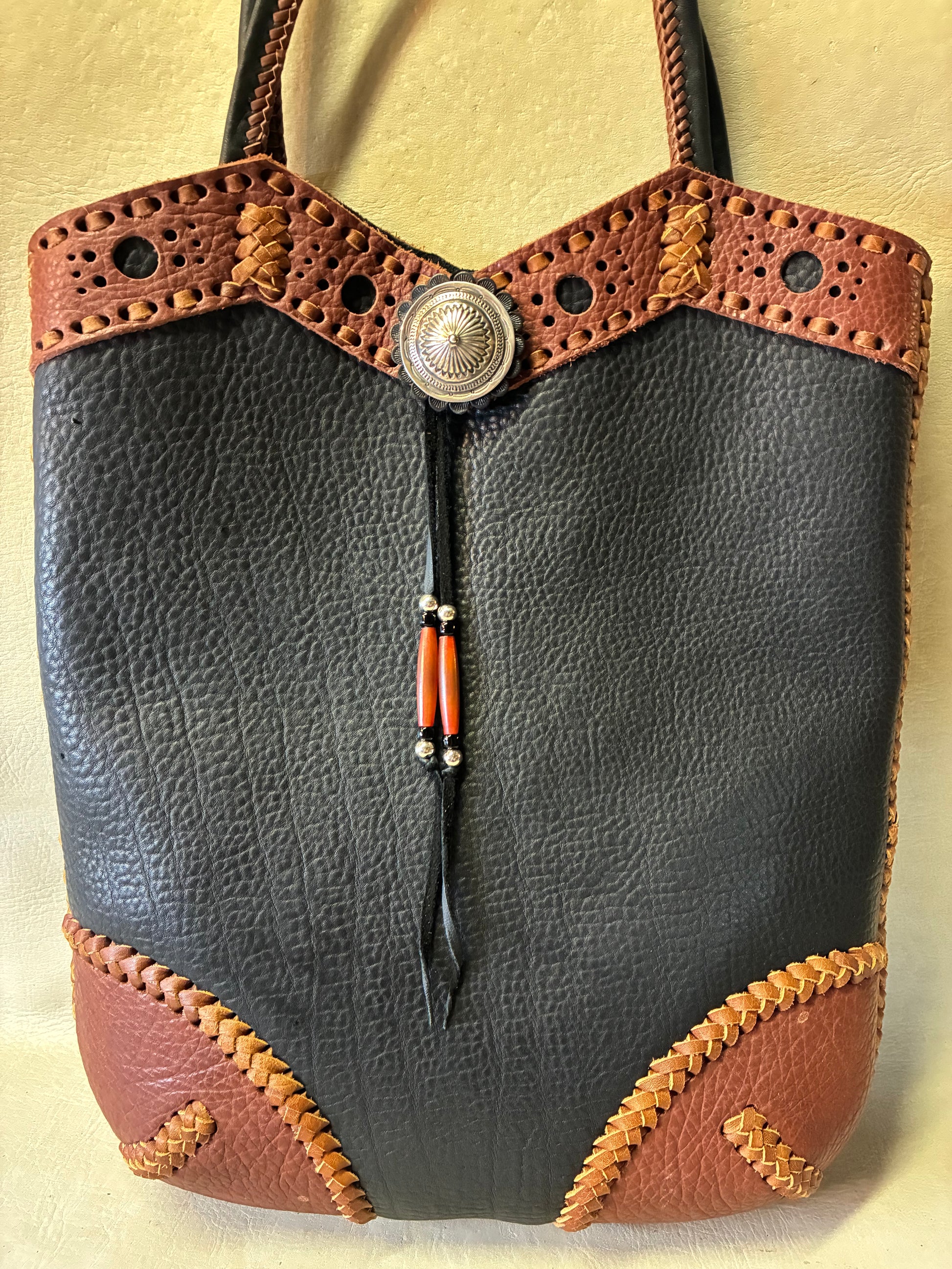 大きめのナバホコンチョと925Silver ビーズとHoneビーズが付いた贅沢なバックに仕上がっています。